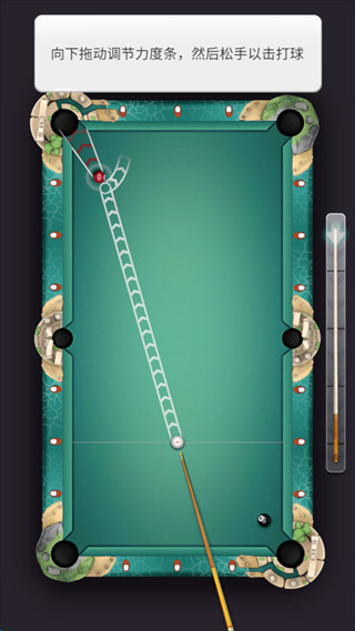 2、白球击打轨迹会显示被击打球的大致滚动方向,通过向下滑动屏幕右下角的“进度条”控制击打力度。