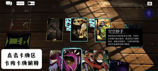 首先介绍一下游戏中冒险者们接触最多的场地界面,在画面最底下从左到右分别是角色的技能卡,中间的角色状态卡和右边的资源卡。在画面最中间会生成3~6张场景卡,玩家可以利用自己手上的技能卡与资源卡与场景卡互动来达成各种各样的效果,长按场景卡会高亮手上可以交互的卡牌,反过来长按卡牌则会高亮可以交互的场景卡并告知交互效果。