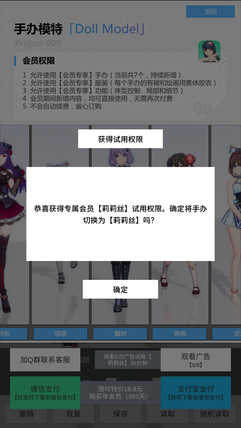 1、进入手办模特单机版游戏内选择获取会员选择,这里可以通过兑换码或者使用体验的。