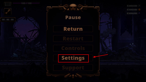 1、打开skul英雄杀手手游,过完新手教程后,点击左上角设置;