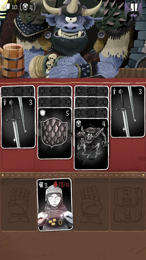 4、玩家需点击卡牌,让后放入下方格子中,并攻击上方的怪物卡,以及使用防御卡抵御怪物攻击;