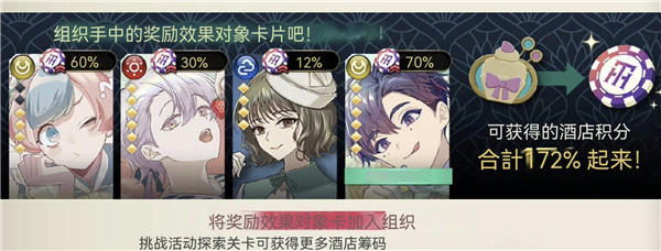 3、将奖励效果对象卡加入组织,挑战活动探索关卡可获得更多酒店筹码。