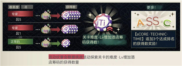 4、活动纹章会根据挑战活动探索关卡的难度,增加酒店筹码的获得数量。