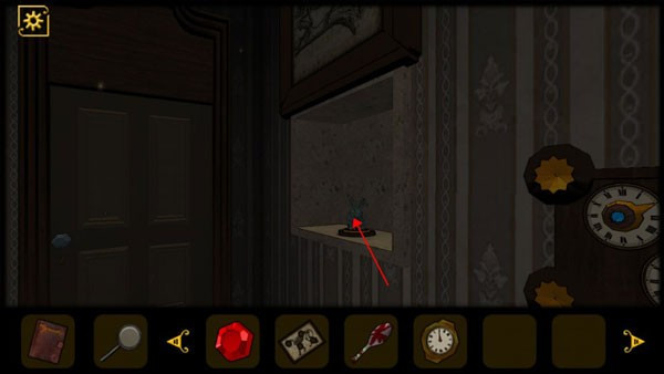 5、查看桌子抽屉,获得道具和查看日记,将红色机关石放入墙上的红色凹槽中,回头会发现进门处出现一只怪物,将门关上,注意门上的花纹