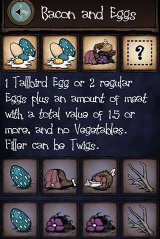 熏肉蛋:2鸡蛋+1怪物肉+1小肉鸡蛋就是拿怪物肉去喂鸟+20血75饮食5精神