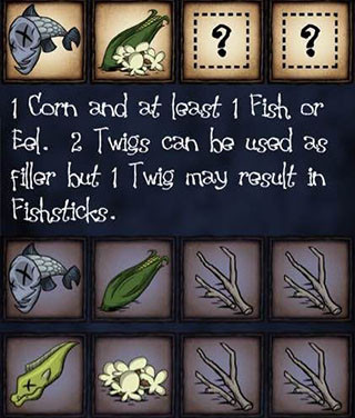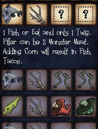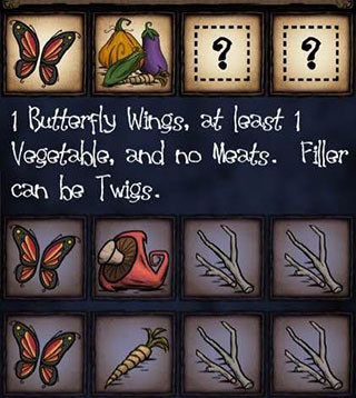 frogglebunwich(蛙腿土司?):蛙腿+1蔬菜+2树枝(蛙腿换蝴蝶也是个不错的蝴蝶松饼)+20血37.5饮食5