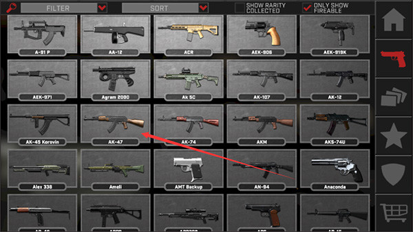 1、进入真实枪械2后,在主界面点击右侧的“枪械”按钮,即可打开枪械库;