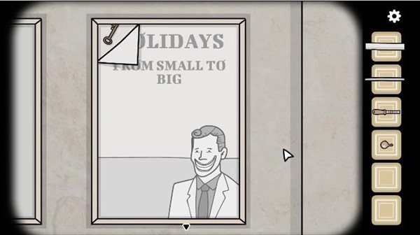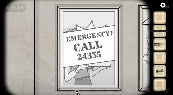3、回到母女身边,向右切换场景,点击墙上的海报,看到提示“从小到大”,我们按照这个顺序依次点击海报中的物体,完成后在海报左上角得到一把钥匙。