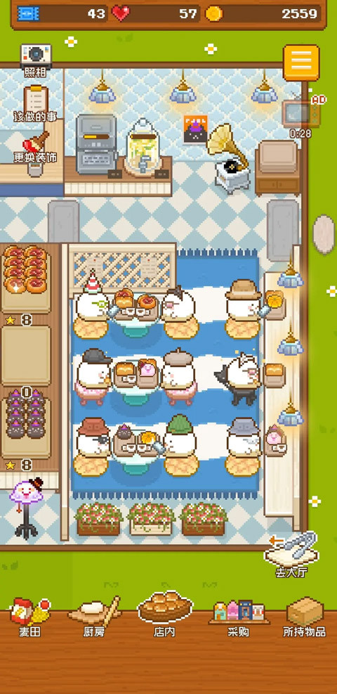 2、玩家通过不断升级可以解锁更多家具来装扮自己的面包店,提高顾客的满意程度。