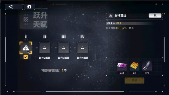 1、每个角色共有三种提升战斗力的方式,除了升级可以直接提升属性外,还可以通过安装芯片、提升武装技能等级和跃升天赋等方式。