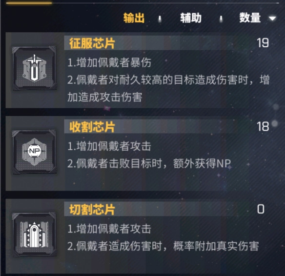 2、每个角色可以安装五种芯片(上,下,左,右,中),因为角色定位不同,所以推荐安装的芯片也不同,输出角色自然就要安装征服者、收割和切割等芯片,来增加输出能力,当然,芯片也有着不同的稀有度和等级,通过升级和安装更好的芯片可以更加有效的提高战斗力哦。