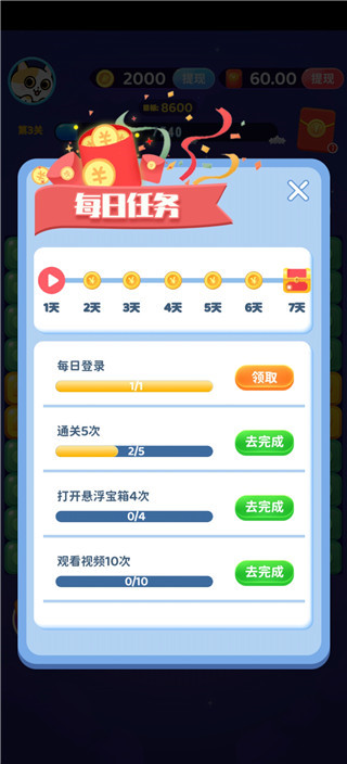6、随着消除不断的通关,每周消除收益持续增加,可以提现