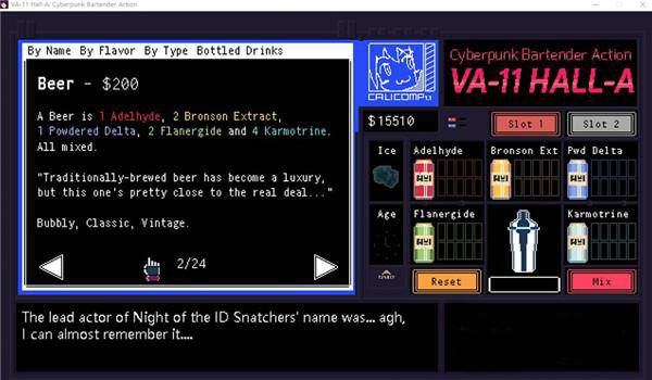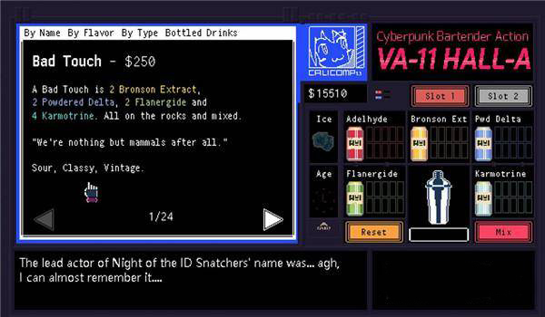 赛博朋克酒保行动中文版是一款非常好玩的游戏,在游戏中,玩家将扮演一个名叫瓦尔哈拉(Valhalla)的调酒师,他会为来酒吧的各类顾客调制合适的酒,让他们逐渐放松下来,讲述自己的故事以了解世界的秘密。游戏中根据不同的客人调酒,给游戏增加了不少难度。他们会根据客户的满意程度讲出不同的东西,从而把剧情引导到各个方面。