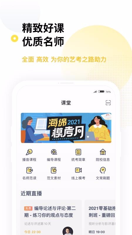 海绵艺考为更多不同考生带来新选择,点击收藏,看完视频巩固练习,为考生量身定做备考计划,用最少的时间,支持学生随时查看练习记录详情,海绵艺考来帮你解决艺考问题!根据用户的知识水平和艺术才能量身打造完善的艺考备考计划,历年真题包括着详细解析,还有实用的备考指南,平台设有专业课程视频直播等,喜欢海绵艺考的用户。