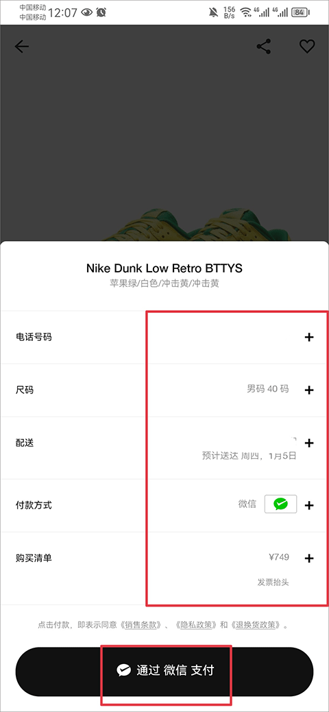 4、将配送地址、电话、付款方式选择完成后点击支付