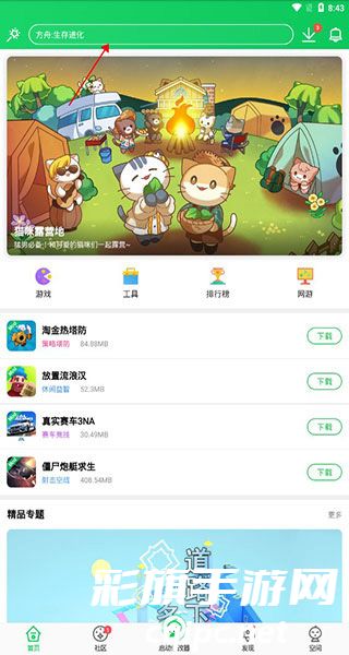 1、安装完成后,打开这款软件进入首界面,在上方可以搜索自己想要下载的软件、游戏;