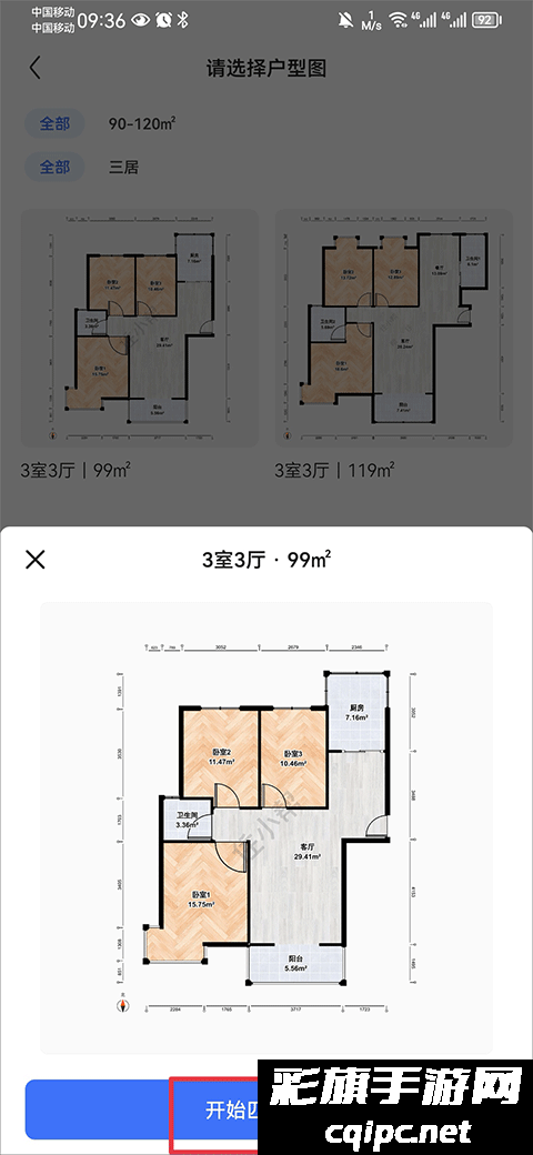 4、输入小区名称后会进入户型的选择,选择后点击开始配案