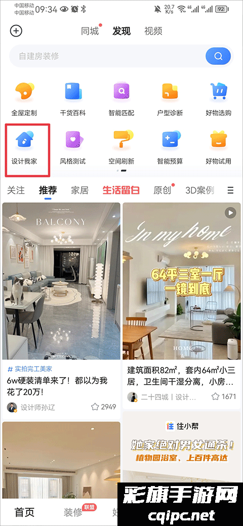 1、在首页中的发现页面中点击设计我家