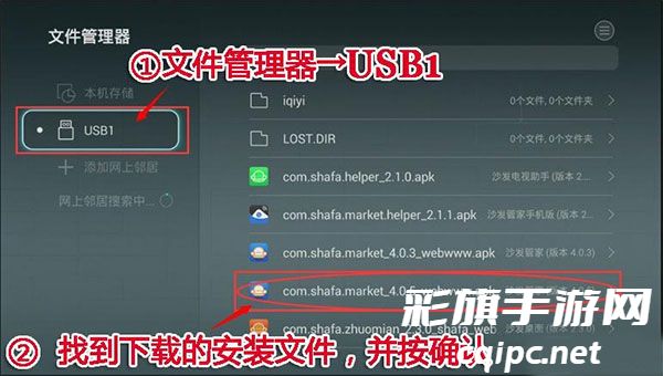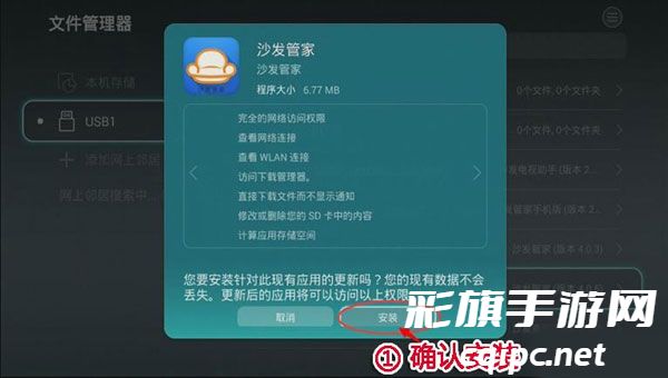 3、 在文件管理器→USB1栏目里找到沙发管家安装文件,按确定 ;