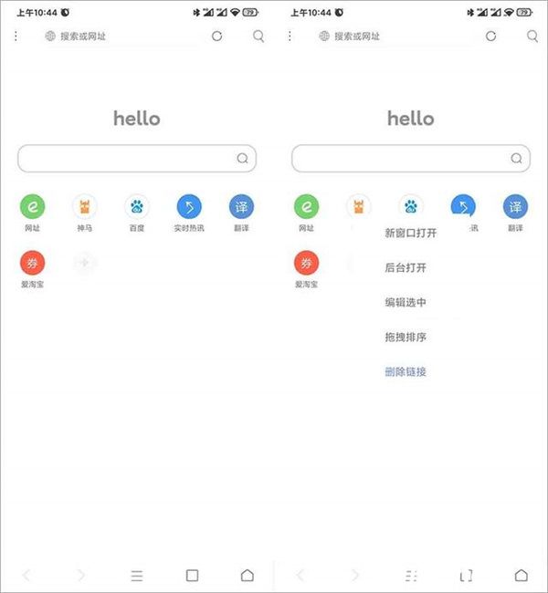 安装好后「米侠浏览器」的默认启动页很清爽干净,不像某些浏览器会推送一些新闻等乱七八糟的功能,如果你对自带的网址不喜欢,可以长按来删除、编辑、或者自己添加一些常访问的网址。