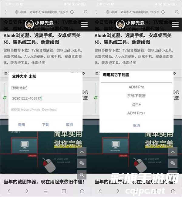 下载也是非常重要的功能,虽然「米侠浏览器」默认的下载功能比较简单,不过支持调用其它下载器,例如 ADM、IDM、系统自带。