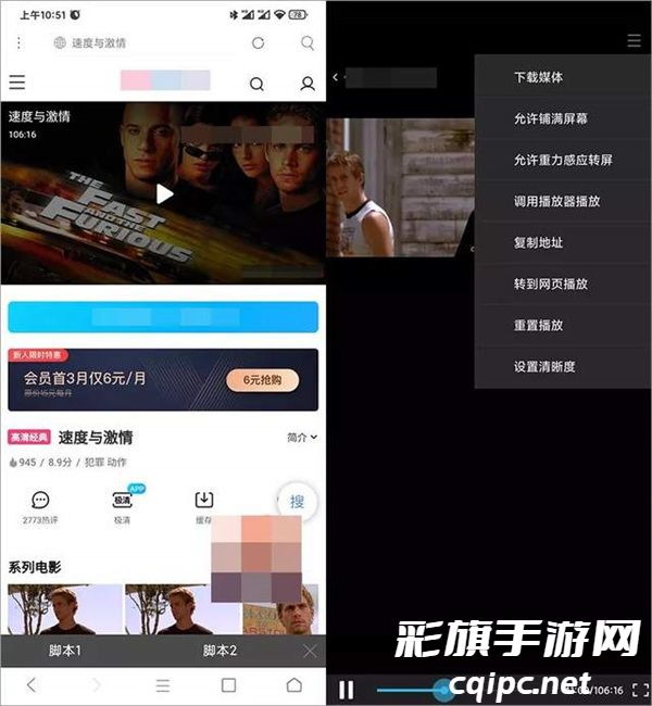 在相关的视频页面上的底部会出现 "脚本1"、"脚本2",点击就可以播放了。播放器功能支持设置清晰度、下载媒体、调用播放器播放,例如 MX Player 播放器。
