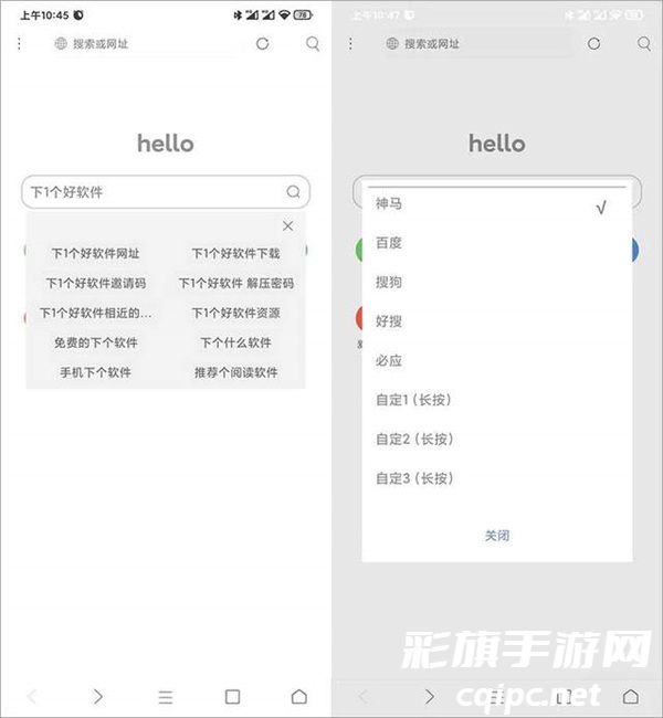 当你在搜索框输入关键词,会自动触发提示相关的关键词搜索,默认的搜索引擎是神马搜索,广告少点,搜索结果可能比某度还是要差点,你在搜索框可以通过长按来修改默认的搜索引擎,也可自定义。