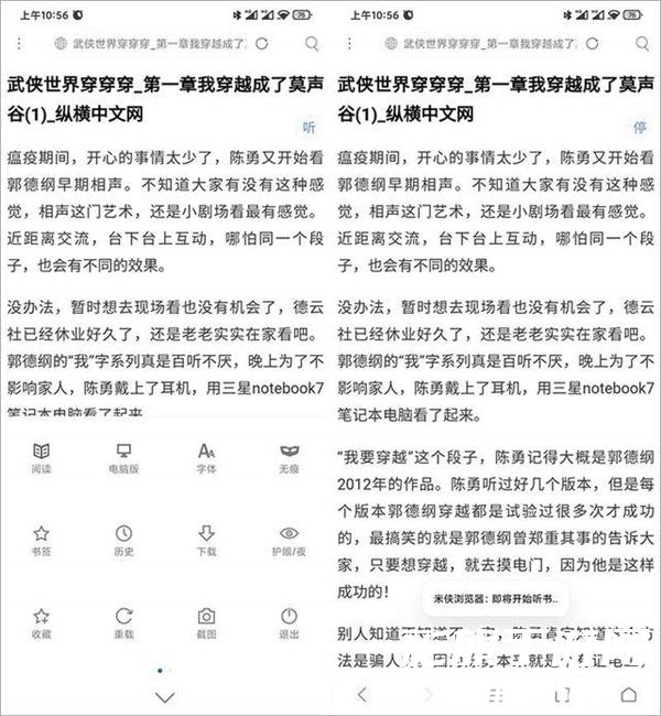 不过「米侠浏览器」的阅读模式为小说党定制,当你切换到阅读模式时,会出现一个 "听" 的按钮,点击后会转成听书模式。你也可以用它来听新闻啥的,非常棒。