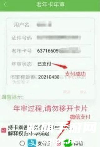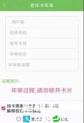 2、登录后返回首页,选择“老年卡年审”功能,选择保费支付方式(微信或者支付宝);