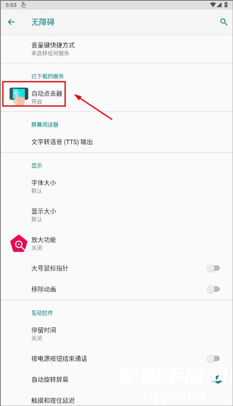 2、进入系统设置后,找到“自动点击器”,并点击进去,选择开启选项。