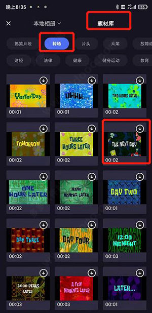 2、跳转的页面点击素材库 ,点击转场