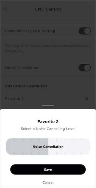 在Bose Music应用程序中 ,使用 您的产品 屏幕上的Noise Cancellation (噪声消除)滑块,将噪声消除从最低(左)调整到最高(右)。