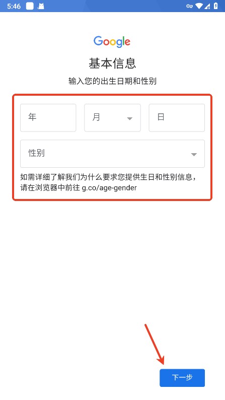 输入出生年月日和性别,点击“下一步”;