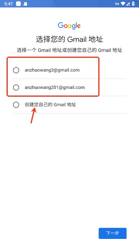 系统会推荐2个谷歌邮箱地址,也可以点最底下自定义;