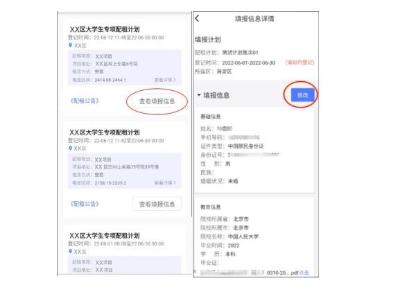 进入保障性租赁住房专项配租页面→点击“查看填报信息”→进入填报信息页面→点击“修改”→进入填报信息,修改数据完成后→点击“提交填报”