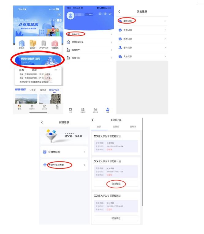 进入北京保障房app→点击“我的”→点击“我的记录”→点击“配租记录”→点击“取消登记”按钮→弹出提醒框,点击“取消登记”