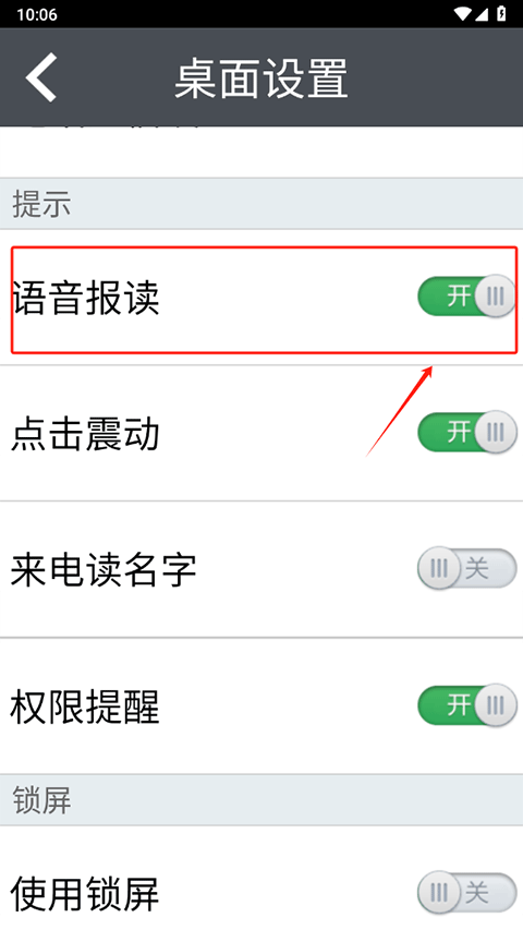 4、语音播报功能同样在桌面设置页面内将语音报读功能开启就可以使用啦