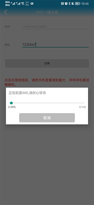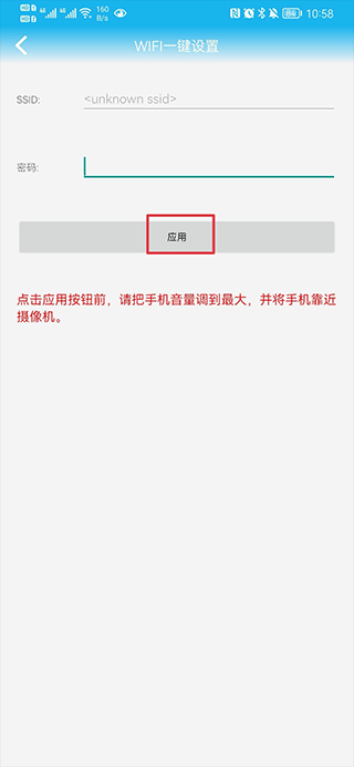 三、输入密码并点击应用(连接时请将手机音量调高,并靠近摄像头)