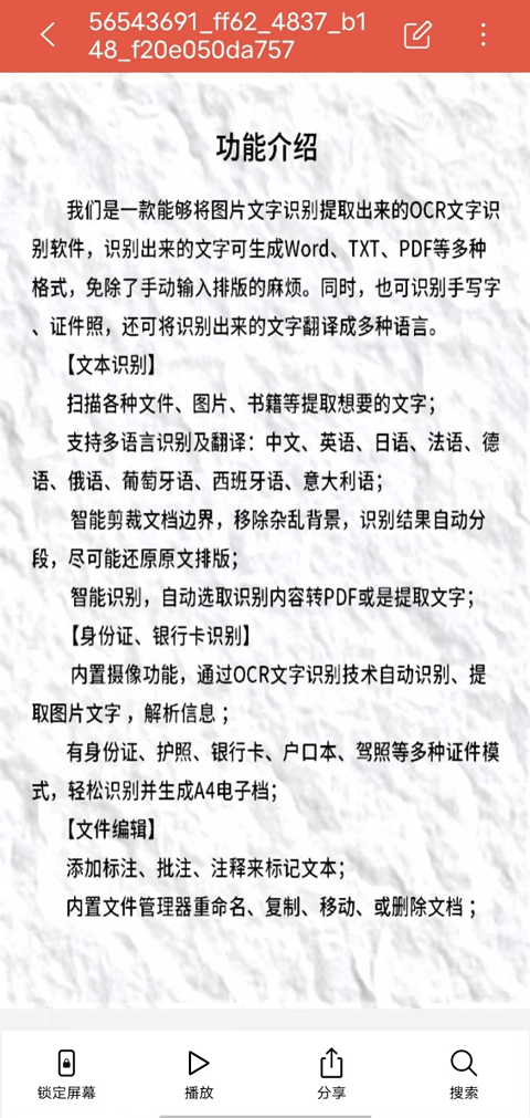 5、保存完之后,你会进入我的文件页面,在这里可以选择点开你想查看的文件,进入文件之后,点击右上角的三个点会出来打印、投屏、缩率图、设置和用其他应用打开的功能,要根据你的实际情况运用这些功能。你还可以点击编辑,对文件进行编辑,还有底下的锁定屏幕、播放、分享和搜索功能。