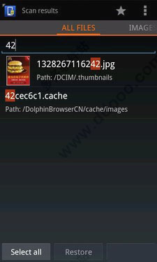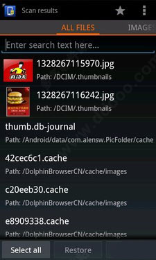 该软件花费少量时间,将手机存储器中所有曾经被删除掉的文件,全部都重新找回来,当然这些文件都是用户单纯在手机存储器中(SD卡)中无法看到的。在这里该软件将所有找回的文件分为具体五个类别(类别的具体介绍前文已讲述),供用户更精确查找。