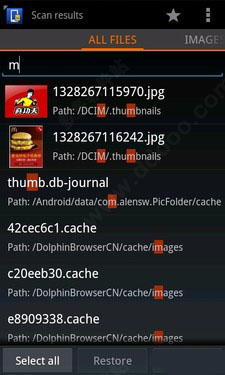 主体功能测试完毕之后,接下来我们来一起测试软件一项重要的辅助功能--搜索功能。在前面的测试中,我们也看到,通过软件所扫描出来,在手机存储器中曾经被删除的文件数目可能会很多。在这些文件数量特别多的情况下,我们来使用这个搜索功能,将会是很便捷的选择。