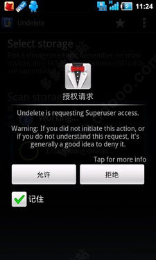本身的运作需要得到Android系统给予权限,通常情况下,安卓系统在运行Undelete前,需要进行Root(授权用户为超级用户级别)。如上图所示,用户需选择“允许”授权方可使用。