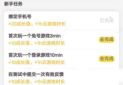 2、新手任务:完成里面的新手任务也可以获得时间增加,通过绑定手机号以及试玩云游戏的方式可以在里面增加相应的时间;