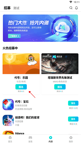 1、进入腾讯内测手游app,选择你要参与的内测手游,这里我们选择"代号:乐园"手游,点击报名;