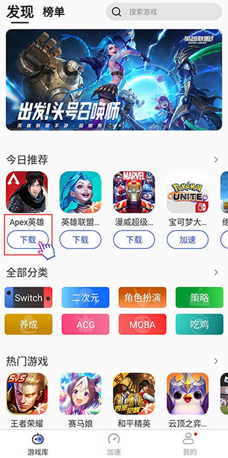 进入游帮帮加速器,在【游戏库】首页或搜索“Apex英雄”即可找到,点击“下载”,下载完成后点击安装。
