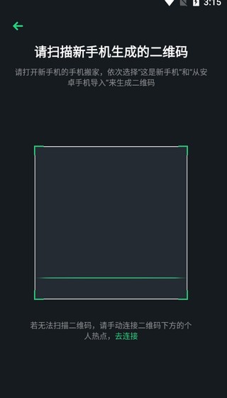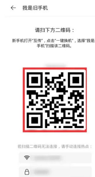 2、打开旧手机「手机搬家APP>这是旧设备」后,就会出现扫码界面,用旧手机扫描新手机上的二维码;