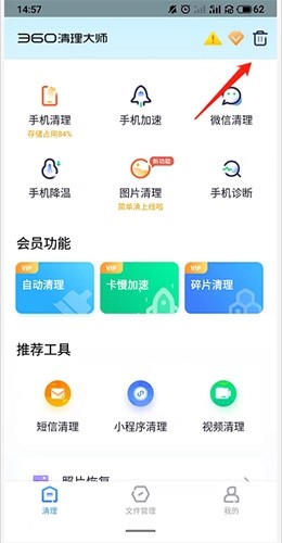 3、点击360清理大师首页,设有手机清理、加速等功能,还有会员功能与短信清理等推荐工具。