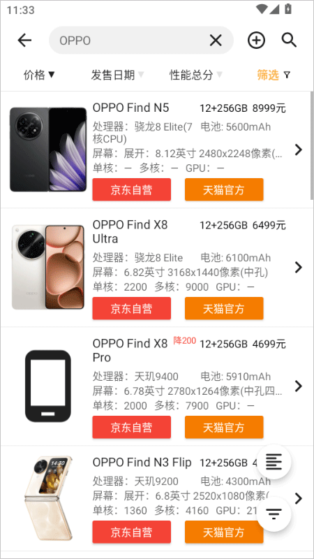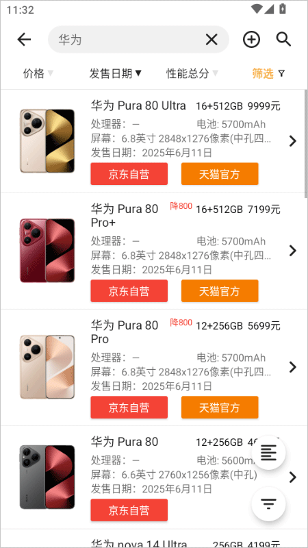 4、手机购买列表和手机详情中添加了手机厂商的京东自营和天猫官方店铺的推广链接,用户可跳转后查看到手机的详细信息和购买。