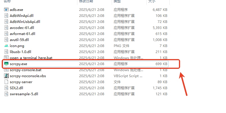 启动 scrcpy:定位到你已解压的 scrcpy 文件夹,并双击 scrcpy.exe 文件启动投屏应用。