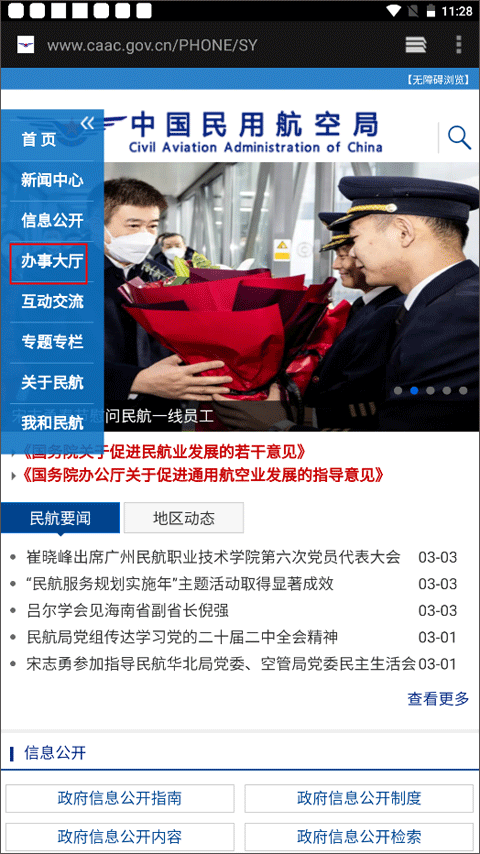 3、开通了新闻、公开、办事、互动及出行等栏目,第一时间权威发布民航局重大新闻;